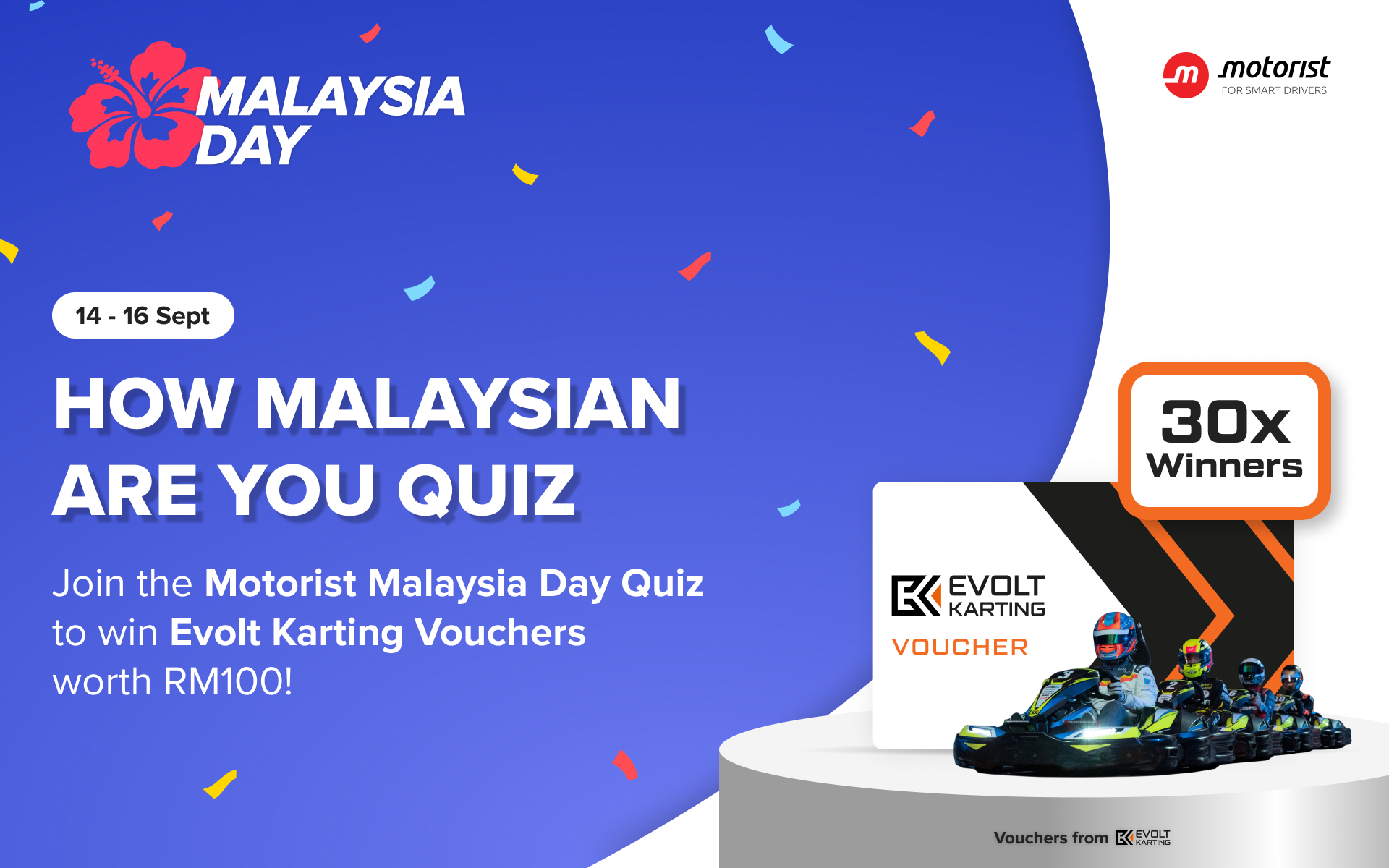 Soalan-soalan ini akan menyentuh topik-topik yang berkaitan dengan sejarah negara kita, fakta kereta, dan Motorist - jadi pakailah topi pemikiran anda! Setiap daripada 30 pemenang kami akan memenangi baucar Evolt Karting bernilai RM100.
