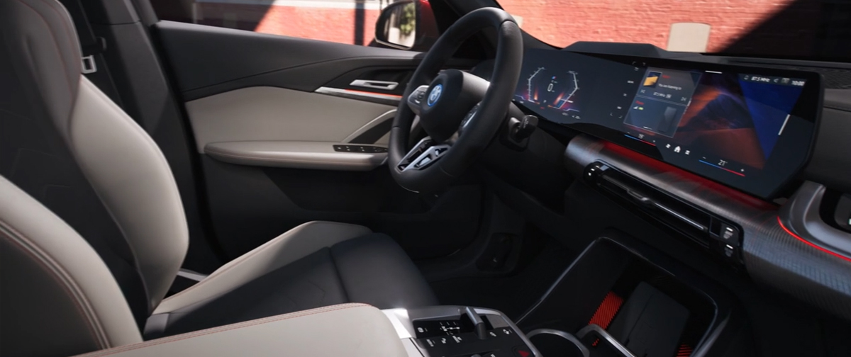 Interior iX2 dilengkapi dengan reka bentuk kulit tiruan 'Veganza' dalam pelbagai kombinasi, termasuk Alcantara M hitam dengan jahitan kontras biru, berlubang hitam, berlubang Coral Red dan hitam, kombinasi berlubang Abu-Abu Atlas dan Putih Asap, dan berlubang Mocha. Sistem hiburan yang dikuasakan oleh Sistem Pengendalian BMW 9 mempunyai iDrive dengan Pembantu Peribadi Bijak dan sistem kawalan QuickSelect, yang berdasarkan Projek Sumber Terbuka Android (AOSP). Integrasi ini termasuk skrin utama yang diselaraskan semula dengan widget langsung yang boleh disesuaikan untuk akses cepat kepada ciri-ciri yang biasa digunakan seperti Peta BMW. Selain itu, Proactive Care memberikan pemandu gambaran yang komprehensif tentang keperluan penyelenggaraan kenderaan.
