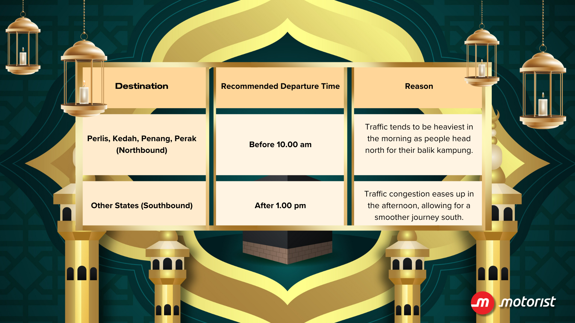 Elakkan hari puncak perjalanan: Beberapa hari pertama Raya (biasanya jatuh pada hari Rabu atau Khamis) dan hujung minggu berikutnya menyaksikan jumlah trafik tertinggi.