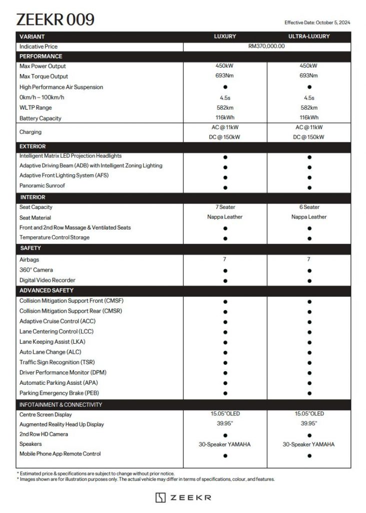 Zeekr 009 ditawarkan dalam dua varian iaitu Luxury dan Ultra Luxury. Walaupun spesifikasi kedua-dua varian hampir sama, perbezaan utama terletak pada susun atur tempat duduk dan butiran dalaman.