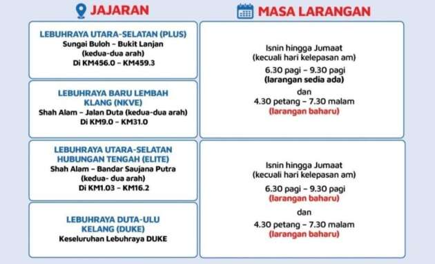 Larangan ini diumumkan melalui satu hantaran Facebook oleh Lembaga Lebuhraya Malaysia (LLM), yang menyatakan bahawa kenderaan Kelas 2 dan 3 tidak dibenarkan memasuki empat lebuh raya utama dari jam 6.30 pagi hingga 9.30 pagi serta dari jam 4.30 petang hingga 7.30 petang pada hari bekerja.